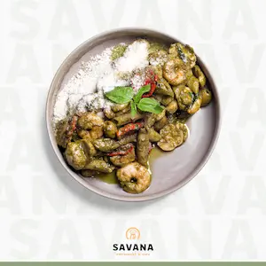 200 گرم میگو، پنه، ریحان ایتالیایی، گوجه خشک، زیتون گریل، پنیر پارمسان، سس پستو