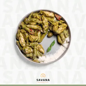 200 گرم فیله مرغ، پنه، ریحان ایتالیایی، گوجه خشک، زیتون گریل، پنیر پارمسان، سس پستو،