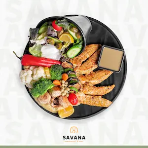 5 عدد فیله مرغ گریل شده، پوره سیب زمینی، صیفی جات گریل شده(کلم بروکلی، گل کلم، بادمجان، کدو سبز، فلفل کاپی، قارچ)، سالاد، سس گردو رژیمی ساوانا