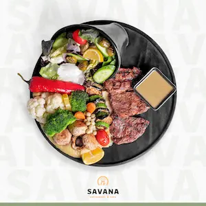 250 گرم استیک فیله گوساله، پوره سیب زمینی، صیفی جات گریل شده(کلم بروکلی، گل کلم، بادمجان،کدو سبز،فلفل کاپی، قارچ)، سالاد، سس گردو رژیمی ساوانا